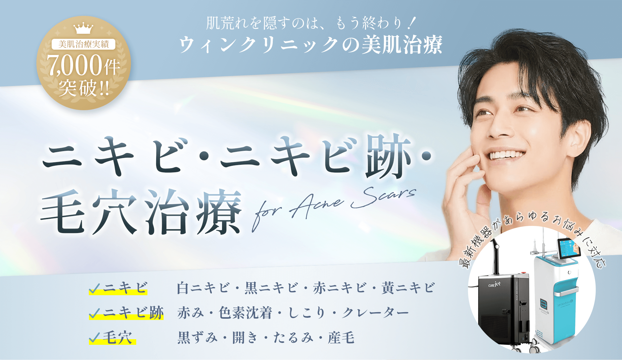 次世代ニキビ跡治療マシンを駆使した”Powered by WIN”のニキビ跡治療で、思わず触れたくなるような美肌へと導きます。
