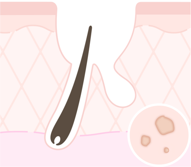 ターンオーバーがうまくいかず、毛穴に皮脂が詰まって肌表面がわずかに盛り上がった状態のニキビです(コメド)。まだ初期段階で炎症もないため、痛みや赤みはありません。