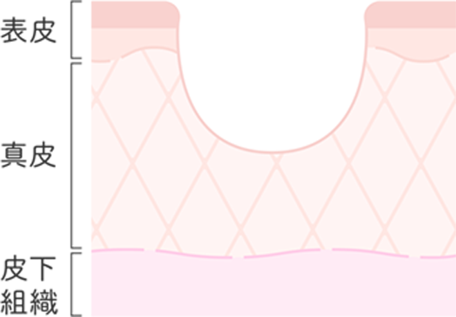 深いニキビの炎症が皮下組織まで及ぶと、瘢痕組織や脂肪の委縮が起こり、皮膚が下に引っ張られてくぼみが生じます。