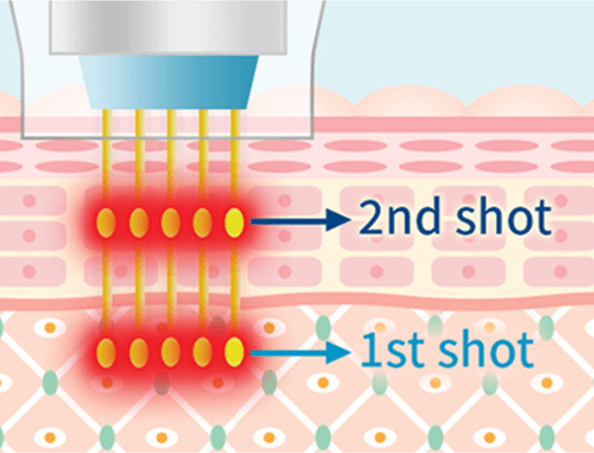 エリシスセンスだけの特許技術「ダブルショット機能」は、1回の刺入で異なる深さの2層にRF(高周波)を同時照射できる画期的なシステムです。